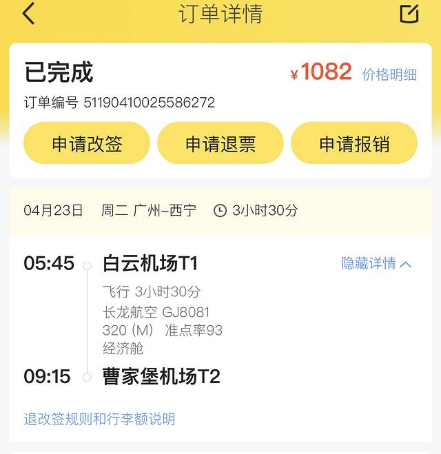 机票方面,我们最开始选择的是南航的往返机票,一人价格为两千元。后来由于南航取消了广州—西宁的航班,所以我们改选长龙航空,票价比南航实惠不少,两人才一千元。回程则依然是南航,中间要经停张家界。