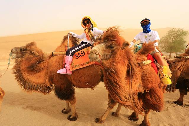 下午五点,我们进入鸣沙山景区。今天敦煌天气不太好,有沙尘暴,我和玲姐全副武装,连眼睛都没露出来。景区门票55/人,当然必不可少的是去骑骆驼了,骆驼100/人。