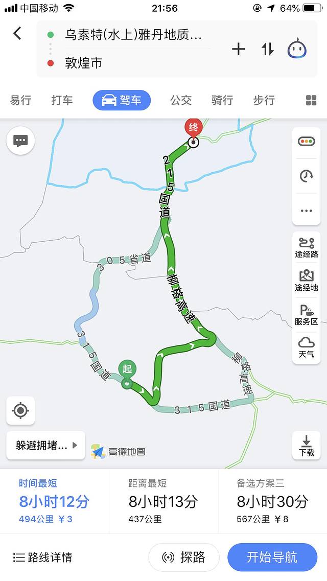 离开水上雅丹,就要前往敦煌了。导航提供了两种路线,其中一种是继续沿着315国道北上到达敦煌,我选择了这条,后来在这里最惊心动魄、甚至有生命危险的经历告诉大家,这条路不可行。