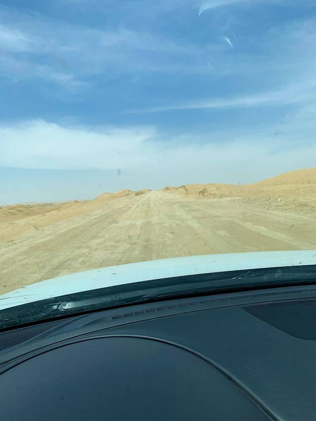 接着我们便跟着导航继续北上,进入了一片与世隔绝,没有任何手机信号,与外界失联的地区。导航把我们带进了一段非铺装的道路,漫天沙尘加上几十公里不见人的荒凉景象,俨然一副真实的魔鬼城。此时我心里非常担心我们的车走这段路会出现问题,有任何差错,我们在这里便有生命危险。