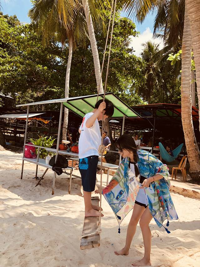 然后我们来到了另外一座小岛用午餐,还有地方可以冲凉换衣服,虽说比较简陋。几张长长的木桌摆在葱郁椰树下,椰树间还绑了吊椅,吃完饭吹着海风,在吊椅上睡一觉好不惬意。