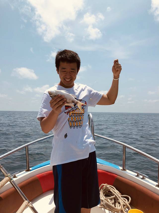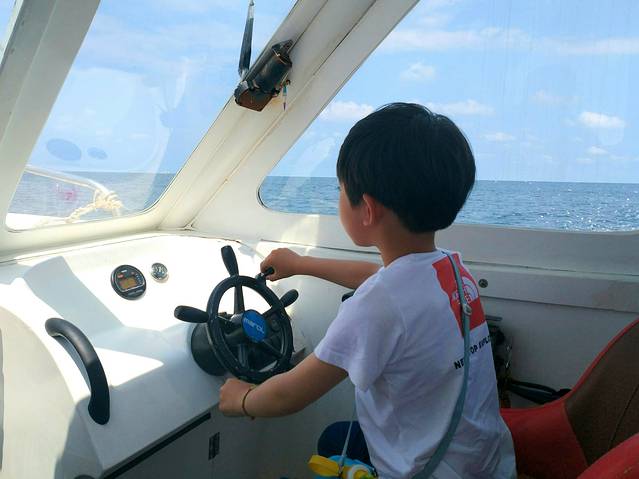 跟小刚约了9点半出发,8点起床,洗漱完毕去吃早餐,磨蹭3人组勉强准时到前台与司机汇合。到码头大约需要45分钟的路程,然后坐快艇差不多20分钟,高贝贝同学还体验了一把当船长的感觉。快艇上除了小刚,还有2个人为我们服务。先是停留在一片海域体验海钓,一根鱼线上绑了2个鱼饵,将鱼线放到海底,基本上下去十几秒钟就有鱼上钩了。我和高贝贝都是钓的小石斑鱼,高爸爸在船头位置钓了2条略大的不知道啥品种。