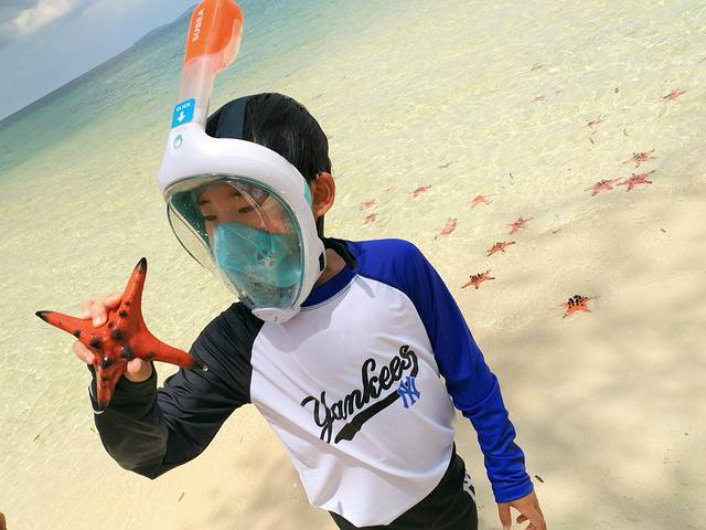 休息的差不多了开始教我们学习浮潜,没想到我这个旱鸭子居然也能浮潜看小鱼。小刚先教会了高贝贝,还带他看了长在珊瑚上像花一样的小生物,手一触碰就缩进去了,过了几分钟又会自己长出来。然后小刚开始教我用浮潜工具,手把手带我下水,直到我慢慢放松,可以脚离地,自己浮起来了,内心既兴奋又紧张。