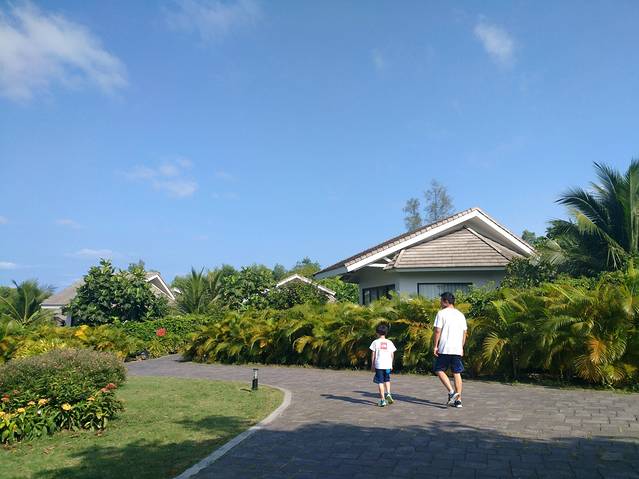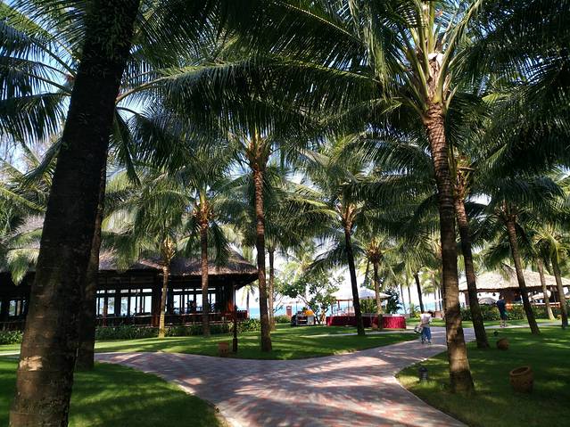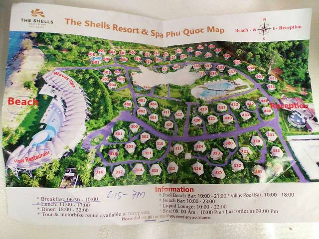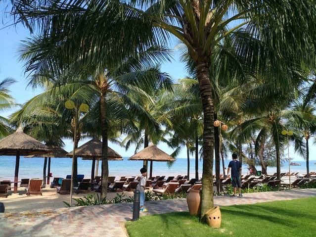贝壳度假村的位置在富国岛中部,酒店前台到外面的马路要穿过一条一公里多的竹林,出行并不太方便。毕竟吃东西还是要去镇上的,我还是推荐住海贝,离东东镇很近。