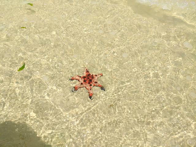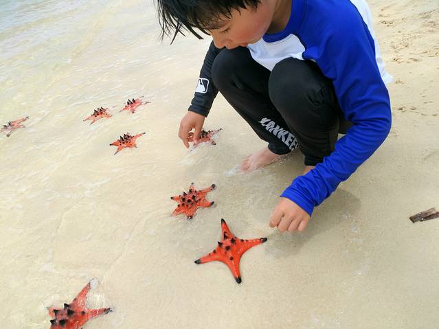高贝贝自己去海里浮潜找到了4角海星和6角海星上来,宝贝的一直让我给他看好它们。