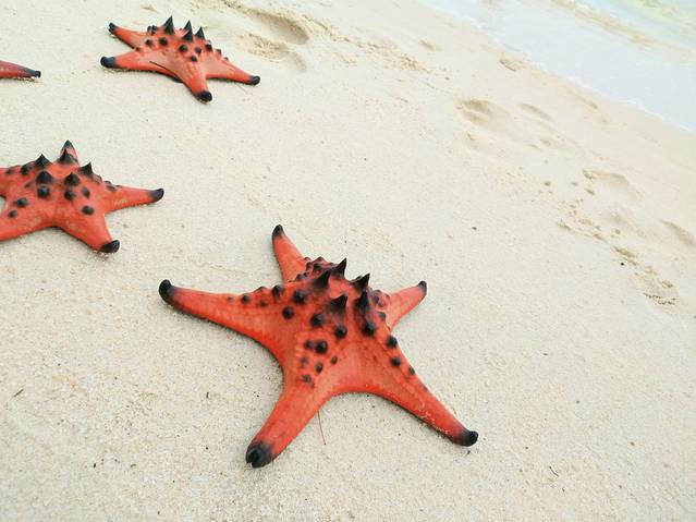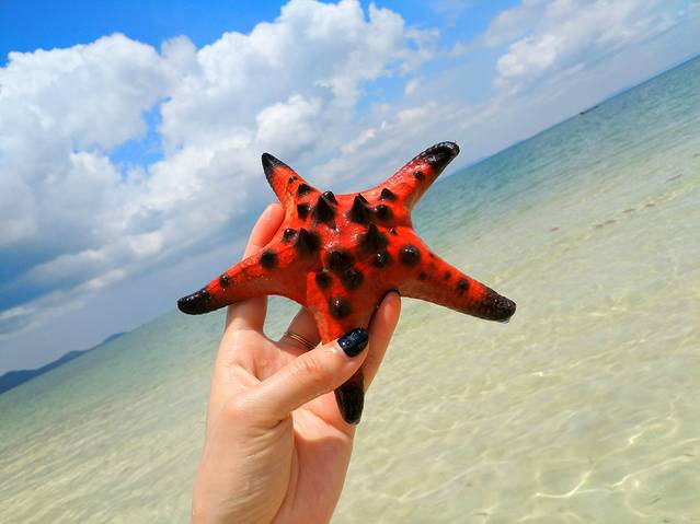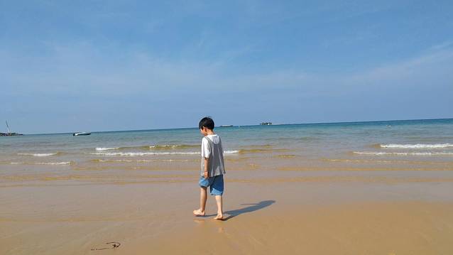这里大概是涵宁渔村,很多攻略有提到在涵宁渔村可以看到海星,的确,海星是在涵宁渔村可以看到,那里也有鱼排可以吃饭的地方。但那里的海水很脏,并不适合游玩。真正的海星沙滩,需要坐船,沿着海岸线开15分钟才会到的。小刚 还给我们带了水果和席子,到了海星沙滩给我们铺在大树下。那里的沙滩比较原始,沙子的颜色略浅,我们去的那天海水比较干净。
