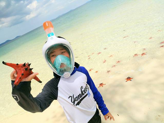 等我俩都学会了,便转战另外一个小岛,那里海水清澈,有很多珊瑚和彩色小鱼。穿上救生衣就下水了,谁知老公虽然会游泳,但还从来没有下过那么深的海,有一点紧张,他自己慢慢适应了一下才跟上我们。小刚还准备了芭蕉和面包喂小鱼,这样小鱼们会离我们非常近。我左手高贝贝,右手小刚,高贝贝是戴的潜水面罩,他可以说话,叫我看他之前在海底发现的小生物。反正我全程呆呆的,任凭小刚拉着我到处游,虽说小刚在,但是到比较深的地方,清澈的一眼见底,内心还是有点紧张的,像是恐高的感觉。老公说本来也想拉着我们的,但是他泳技不精啊,拖不动我俩,原地不动,所以是怪我太大只咯。。。