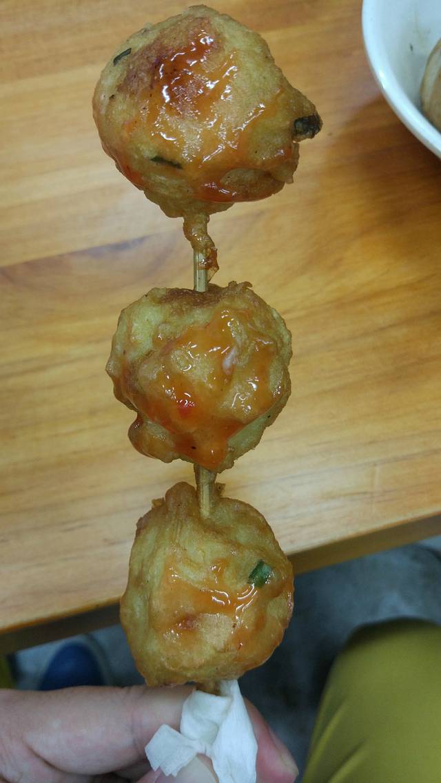 我最喜欢的就是墨鱼丸了,外焦内嫩,还有小小的弹牙,很好吃。吃完后大伙还想吃,可惜太多人排队了,只好放弃了。