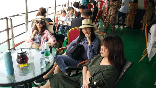 船上一共分了三层,第三层是风景最好的,但要120元一张台5个座位。也有KTV包厢,但应该没人上船就是为了唱几首歌吧。。。所以果断拿了一张桌子。