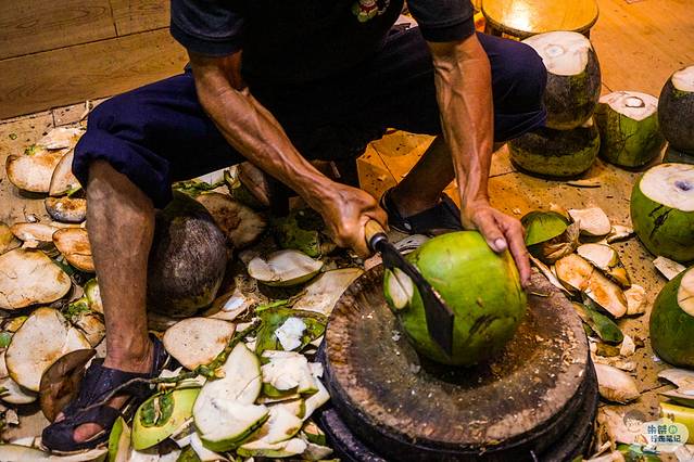 每天果农都会送来新鲜采摘的椰子,但是这里采用的椰子都是比较老的,做椰子鸡使用的椰子是越老的越比较好,椰肉含有椰奶及油,香味浓郁,补益效力更大,养颜滋润。大伯在门口用专用的刀在砍椰子,他主要负责砍开椰子,取椰汁。眼前所看到的新鲜的食材都是最新鲜的食材,也是嗲嗲的椰子鸡使用的新鲜的食材。