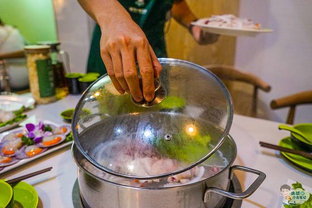 把椰子打开,然后把椰汁倒入配料好马蹄莲、椰肉、红枣的锅内,加大火候。椰汁在后期不够的话,可以免费的找店家添加。和我们平时吃火锅加汤是一样的,嗲嗲的椰子鸡的汤汁全部是采用新鲜的椰汁,而且可以免费供应。喝过新鲜的椰汁和鲜榨椰汁,还是第一次喝煮汤汁的椰汁,口感与众不同,很清新,没有被破坏的原汁原味,我一口气喝了三碗。