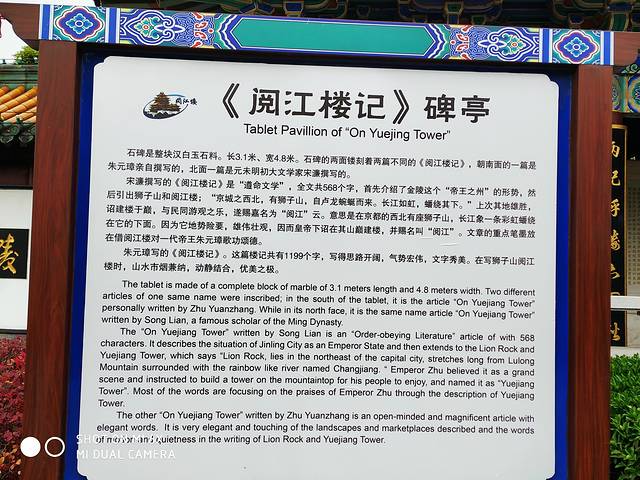 朱元璋撰写的《阅江楼记》,由当代书法家抄写,碑的背面刻的是宋濂所写的《阅江楼记》,被选入《古文观止》。汉白玉从北京房山开采出来,高律3.1米,宽4.8米,重15吨,是全国最大的汉白玉碑刻。