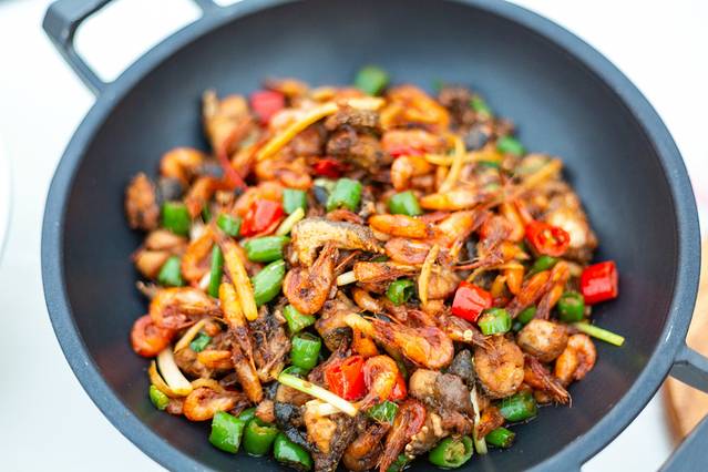 酥炸漓江虾,漓江虾在阳朔也是极受欢迎的一道菜,不少餐厅会用酒生腌,保持其鲜美程度,但是更多人喜欢吃酥炸,一来安全卫生,二来香酥的口感更适合配酒。
