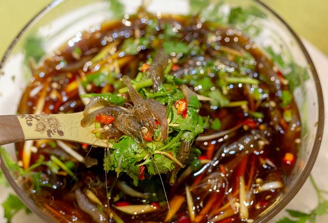 冰镇漓江虾,这几乎是每到阳朔必点的菜之一,上桌时,漓江虾还是鲜活乱跳,几分钟后,已被料酒生腌醉倒,就像鲜虾刺身一样,鲜甜脆口,一口一勺,风味独特。越是浸得久的虾,越是入味,教人越吃越上瘾!