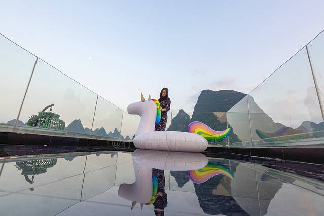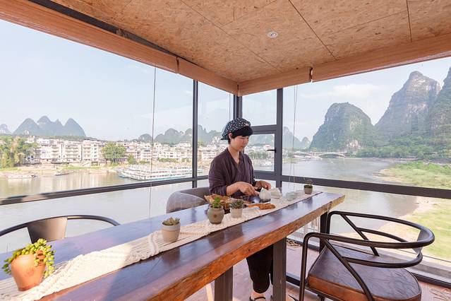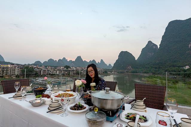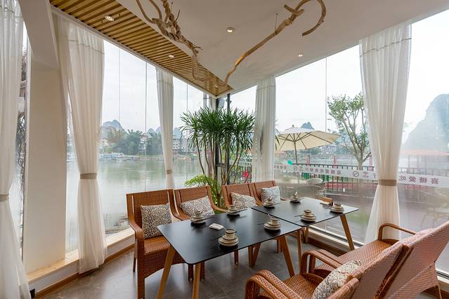 从阳朔县城打车前往我们的第一站喜糖度假酒店,这家酒店紧靠阳朔西街,却没有西街的喧嚣,滚滚的漓江水从窗前流过,站在房间里就可以一览漓江边的山河美景。层层叠叠的山峰被云雾笼罩着,随手一拍就是一张风光大片。