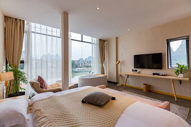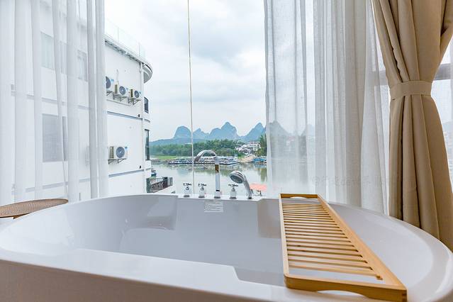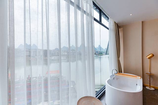 我们提前预定了豪华临江大床房,刚到酒店前台漂亮的小姐姐就送上了一杯清甜的茶水,还热情的帮忙把行李送到房间。推开房间门就被一个靠窗的大浴缸吸引住,好想就这样泡在浴缸里欣赏着阳朔的美景。
