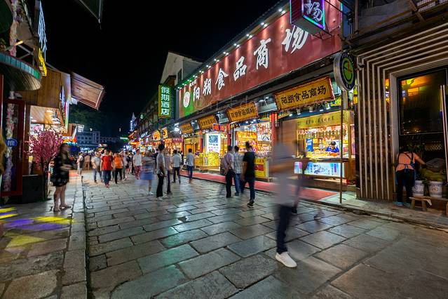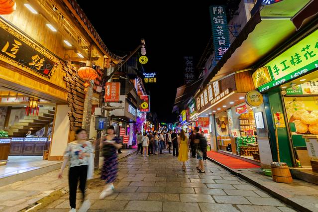 夜晚的阳朔西街人潮涌动,音乐声、叫卖声此起彼伏不绝于耳,许多来到阳朔的人都会打卡的地方我们也没有例外。西街上商铺、酒吧、手工房、纪念品等凡是旅游目的地可以见到的在这里都一应俱全,各色牌匾在夜色里显得格外夺目,街道上来来往往的人潮中分布着不同的肤色,却一切都显得那么自然随意。