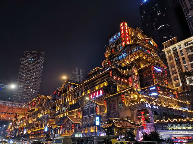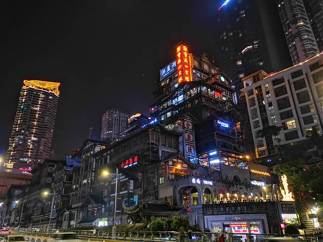 我们到重庆先去找了家火锅店吃火锅。吃完后准备去逛逛洪崖洞看看夜景的,结果时间晚了,洪崖洞已经关灯了。这是熄灯后的洪崖洞。。