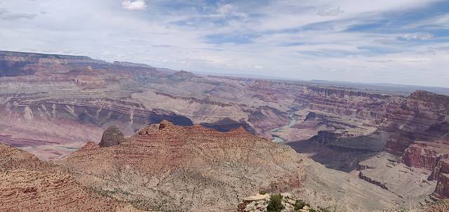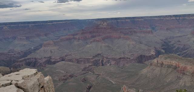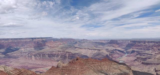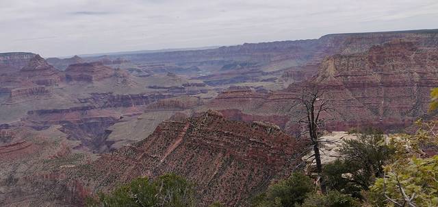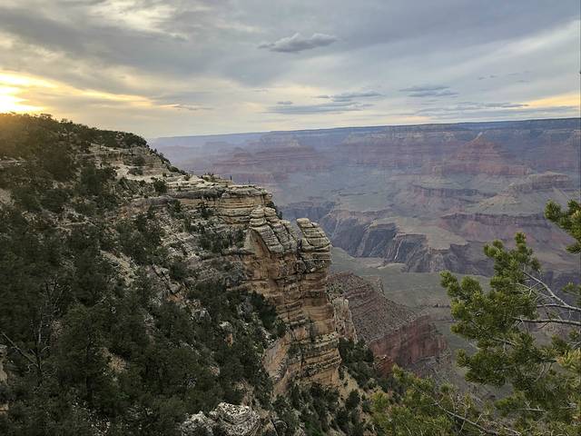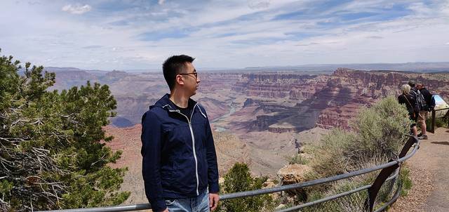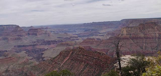 不幸的是这次旅行的天气都不太好,大峡谷阴天了,云彩很厚,没有看到日落。永远记得,转角看到他的第一眼,车上人一起发出惊呼。我想峡谷的司机真幸福,每天都可以看到这种景色。我们坐车来到了大峡谷只有园区大巴车能到的地方,貌似是大巴车到的最东边Yaki Point。