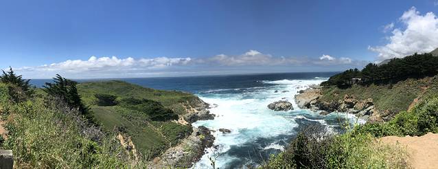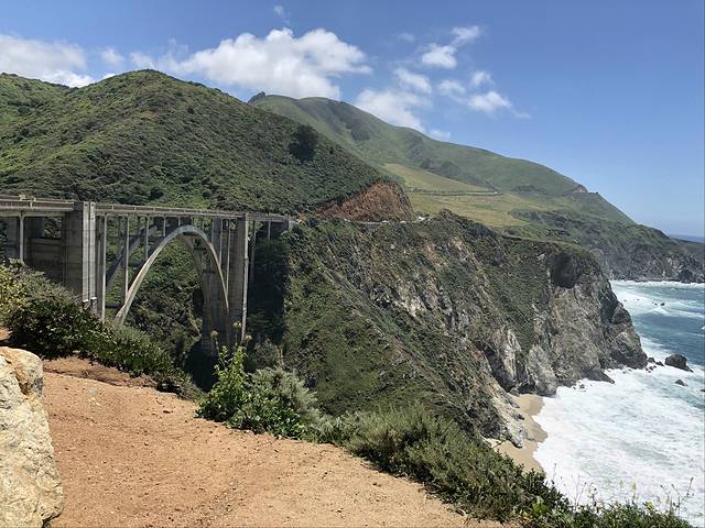 大苏尔是一号公路的精华,这一天的风景主要在大苏尔地段展开,全是盘山路,底下是悬崖。几乎每开一公里就想下车看一下。路边的停车带也很多,感觉形成了一个小的景区一样。我按照限速的标准开,后边还是挤压了一大堆车。美国人开车,很放肆,根本不把限速放在眼里。