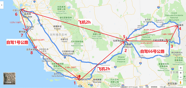 路线的灵感来源于马蜂窝上的美国西部自驾小环线,还有一个大的,需要24天左右。我们选择了小的,现在大的也想跃跃欲试。机票是洛杉矶进出最便宜,因此落地城市是洛杉矶,离开也是。其次大峡谷,羚羊谷,旧金山到洛杉矶的一号公路是必去的,途径一个拉斯维加斯,作为中转站。于是连起来形成了这个自驾路线。