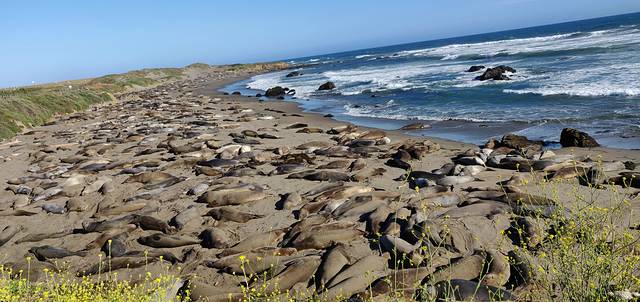 我发现很多国家的动物都不怕人,好像他们都把自己当人。这里的海豹都有一个大肚子,一会使劲往自己身上扑腾土,一会两只开始打架不知道因为什么,密密麻麻的躺在沙滩上,没有围栏,人们举着相机在海岸上看他们,他们也丝毫不害怕,每一只都一副赖赖的样子。