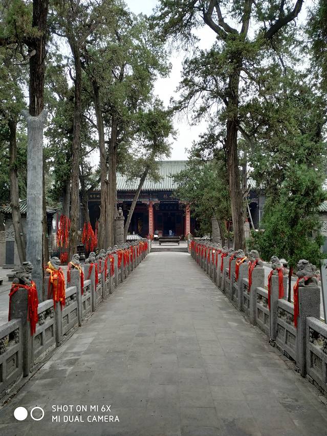 连接仪门和拜殿的石狮御道为海内外关庙所独有,甬柱顶雕石狮104尊,百狮百态,圆润生动,毫无石刻的生硬之感,代表了乾隆时期中原石刻艺术的最高成就。