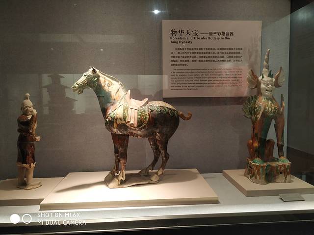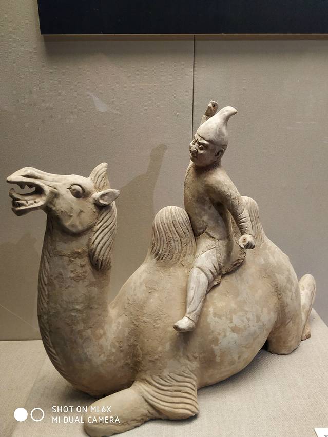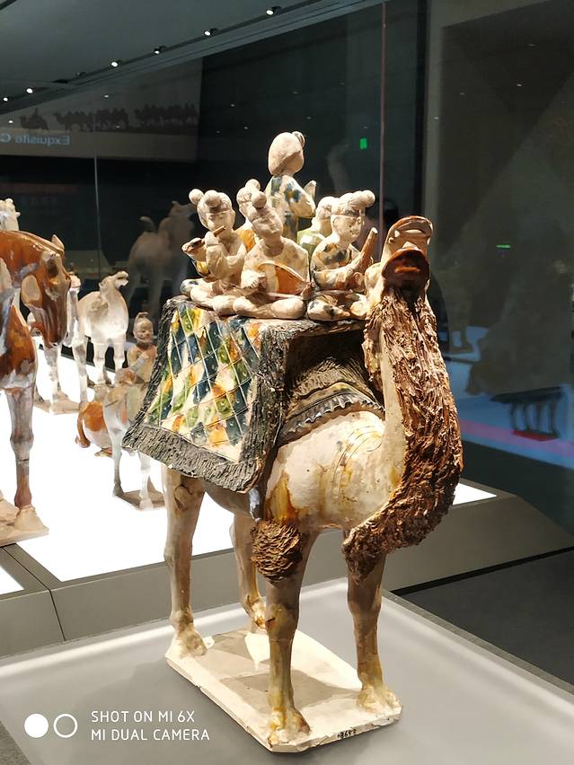 三彩载乐骆驼俑,国宝级文物,骆驼张口嘶鸣,舌尖上卷,驼背的平台上还塑有八个神态各异的乐俑。