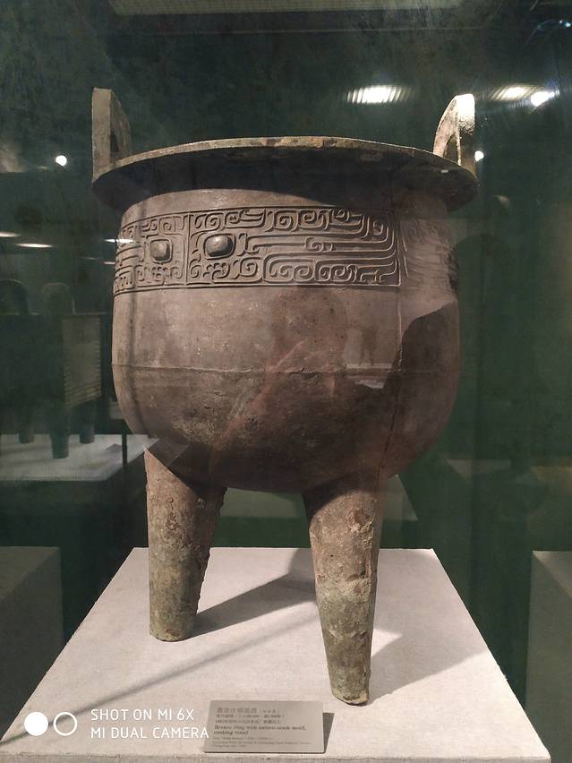 附耳蹄足鼎,颈、肩和腹部均以绹索纹分割。足部上端饰兽面纹。