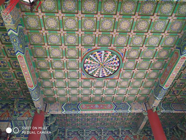 一层大厅天顶“万道霞光”的圆形彩绘图案首先映入眼帘,四周伴有184块由四季花卉组成的彩绘天花,鲜亮艳丽、栩栩如生。