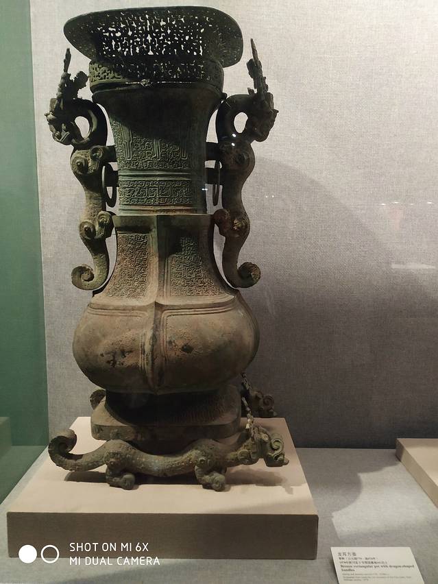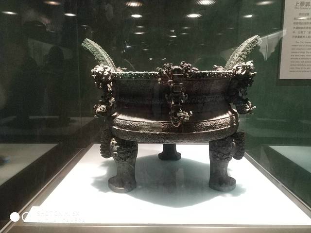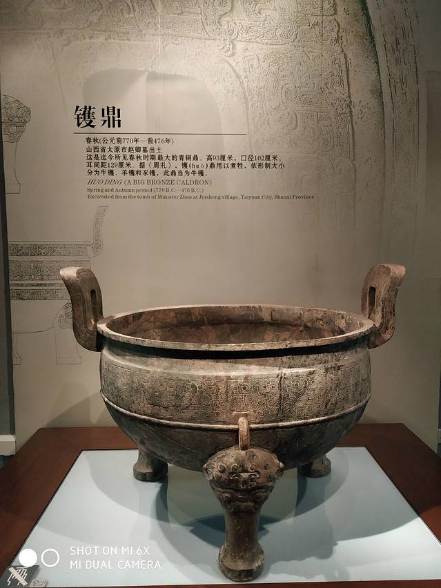 这是楚庄王之子、楚国令尹“王子午”墓中所出七件列鼎之一。鼎身为束腰平底状,侈耳、蹄足,口沿攀附6条龙形怪兽,器腹满饰半浮雕的夔纹和窃曲纹。