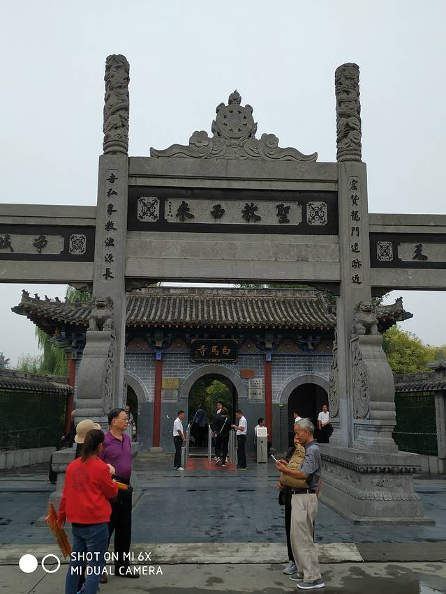 白马寺大门之外,广场南有近年新建石牌坊、放生池、石拱桥。