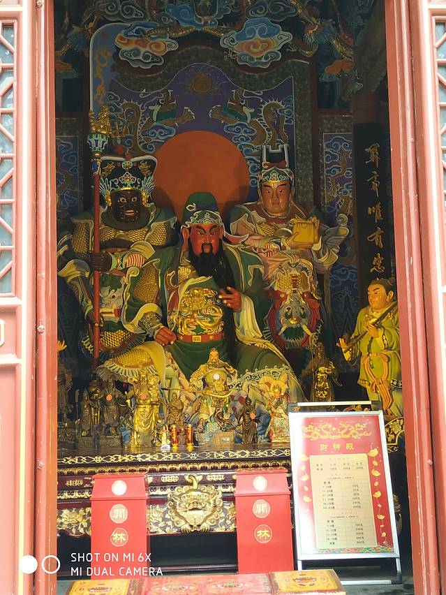 二殿中塑关羽怒视东吴像,左侧站着手棒大印的关平、右侧站着手持大刀的周仓,招财童子、利市童子侍奉身前。