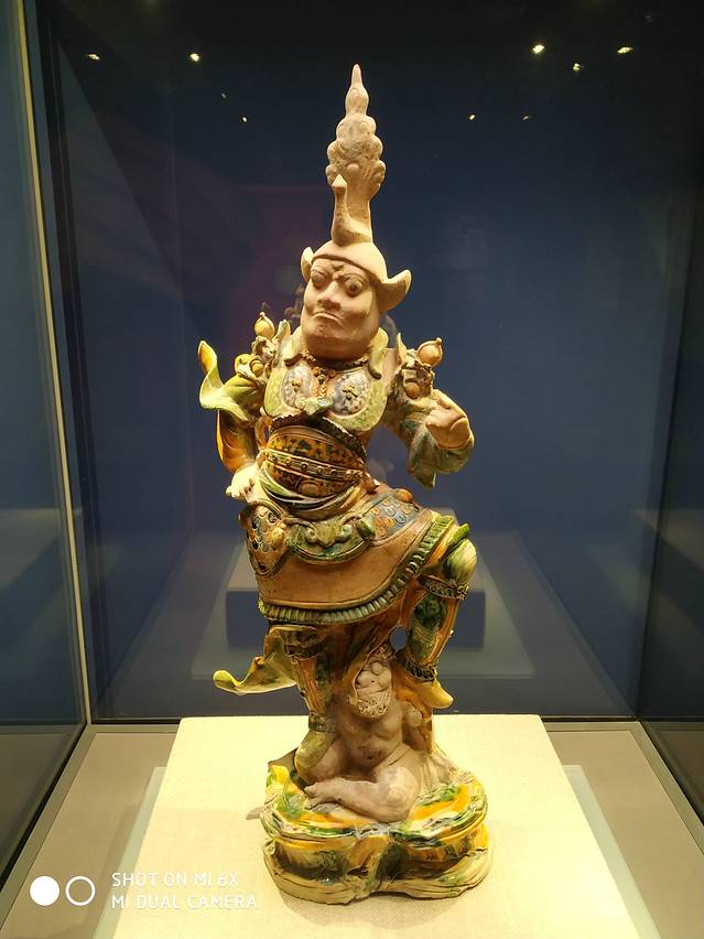 三彩天王俑,唐代,左腿弯曲,踩在小鬼肩部,右腿直立,踏于小鬼腿上,多神气!