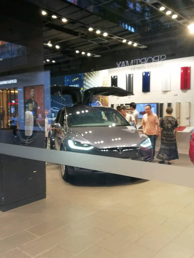 走出商场,来到了特斯拉车车专卖店,看见那个飞起翅膀的车,仿佛在说,“我是挥着翅膀的女孩”。