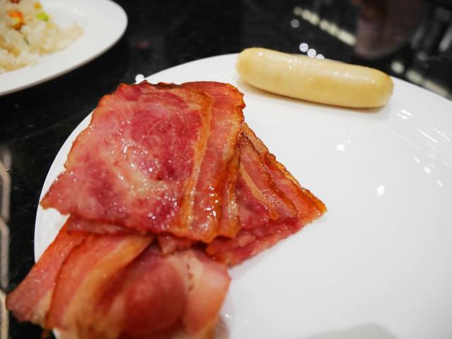 培根煎过但是加热之后水分大,没有了脆度,丧失了口感,香肠是原味的比较淡。