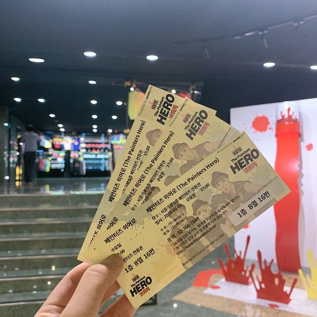 我们是在蚂蜂窝订的门票比较优惠,先去现场取票。不过大家也可以现场购票,4~6万韩币。从地铁出来走约3分钟就可以看到-HERO涂鸦秀-巨幅海报!然后下面有个ticket取票处,拿着票就可以进剧场。