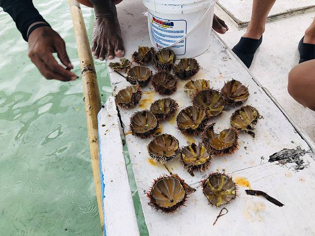 总之就是个我没见过但是还挺有意思的地方。和同船的人一起拼了一筐小海胆尝了尝,第一次吃,打开发现肉也太少了,还是那句话,当尝个鲜了。