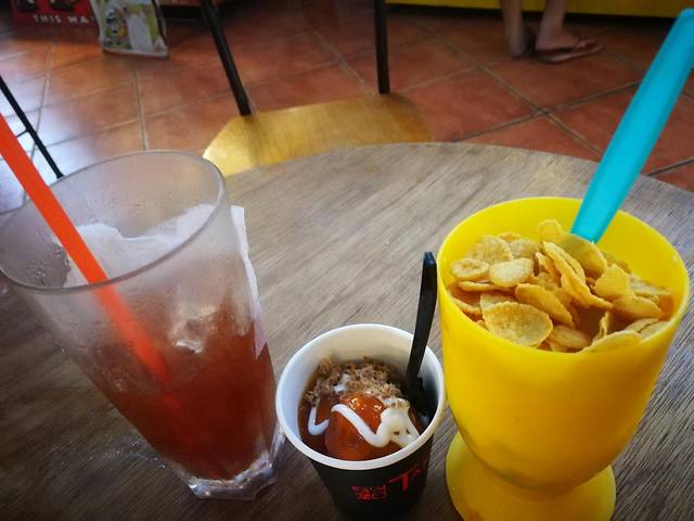 右边的也差不多是一种饮品,但里面物料非常丰盛。中间的有些像章鱼小丸子,最左边的这款饮料喝过很多次,就像是我们这边很多餐厅供应的大麦茶一样,几乎家家都有,但是忘记名字了。口感带甜,加上冰块也太爽了。