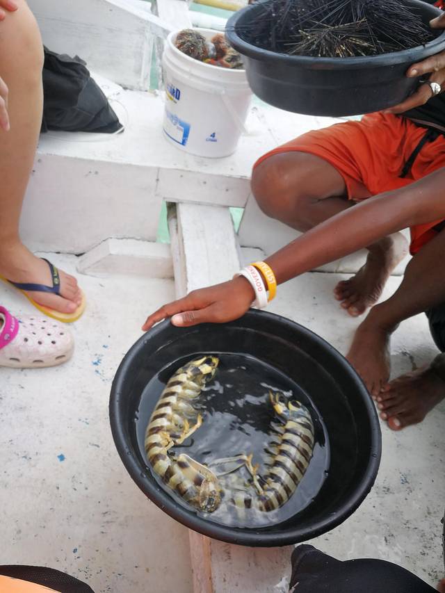 有专门的小船负责喂食,我们坐的是木船,到了之后可以下船浮潜。
