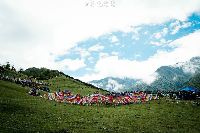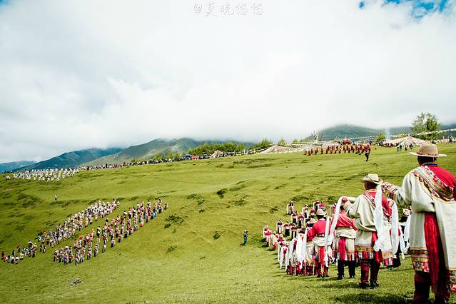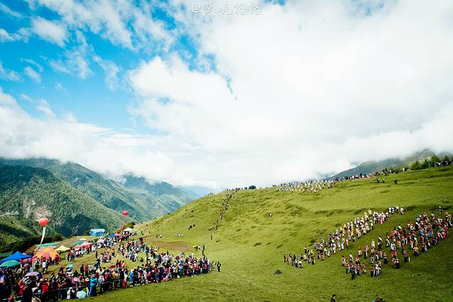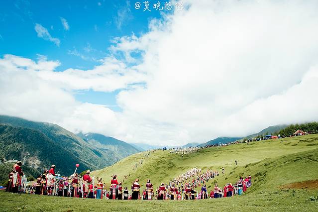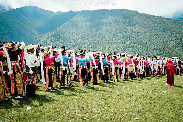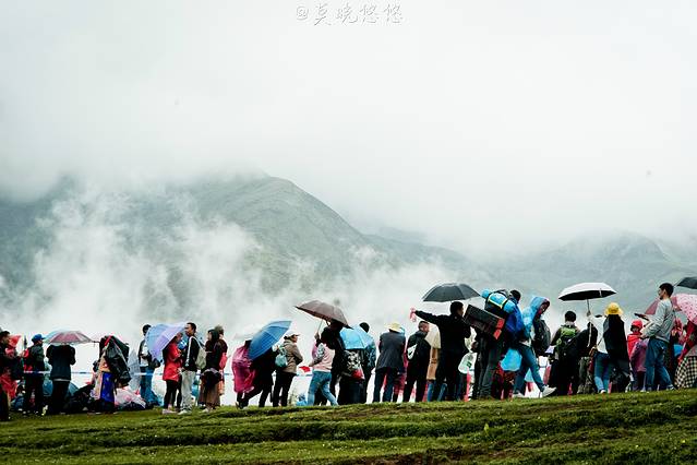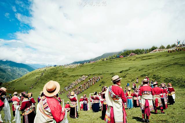 在斜坡之上,站满一排一排身着节日盛装的当地人,他们都手捧洁白的哈达,向圣山方向站立着,静静等着盛典的吉时。