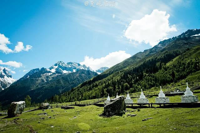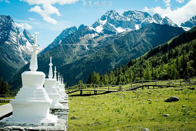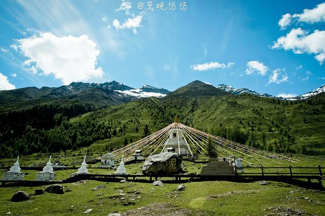 雪白的白塔跟雪山相映成辉,在这么一大片绿萌之中显得更加的瞩目,这些都是承载着心灵上美好的寄托。