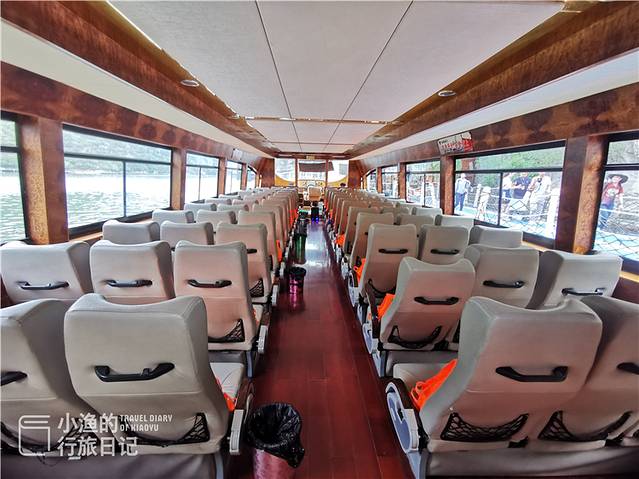邮轮是两层,上面一层是甲板,可供赏景、拍照。下面一层则有很多座椅可以休息。这真的是一趟无比惬意的旅程了,站在甲板上一边吹着风、欣赏高峡平湖的景色,一边听着导游介绍青天河大泉湖的历史。