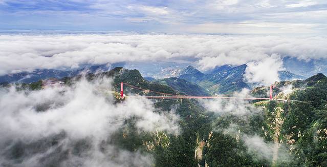 此桥连接望海楼和玉皇顶两个景点的人行天桥。该桥总投资约8000万元,桥跨布置采用双塔单跨吊悬索桥,中跨长度420米,边跨长度分别为38米和47.5米,全长505.5米,为世界最长、跨度最大的人行索桥。大桥主梁宽4米、人行道宽2.4米,桥面距离谷底的高度为143米,宽跨比1:120。为增加结构的抗风稳定性,在桥面下方设置了抗风缆,通过抗风缆索将桥面与抗风缆索相连接,在国内人行桥梁中首次增加了桥梁健康监测系统与巡检通道。人行索桥的建成避免了游客穿过深达143米的娄子沟,节约40分钟的行程。