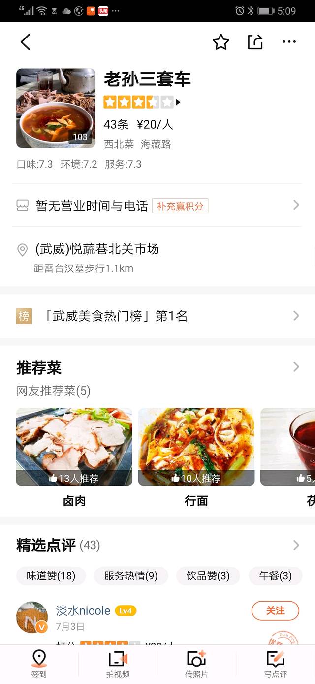 我建议去吃武威的“三套车”,曹垠从“大众点评”上查了一下,首推的是老孙三套车!