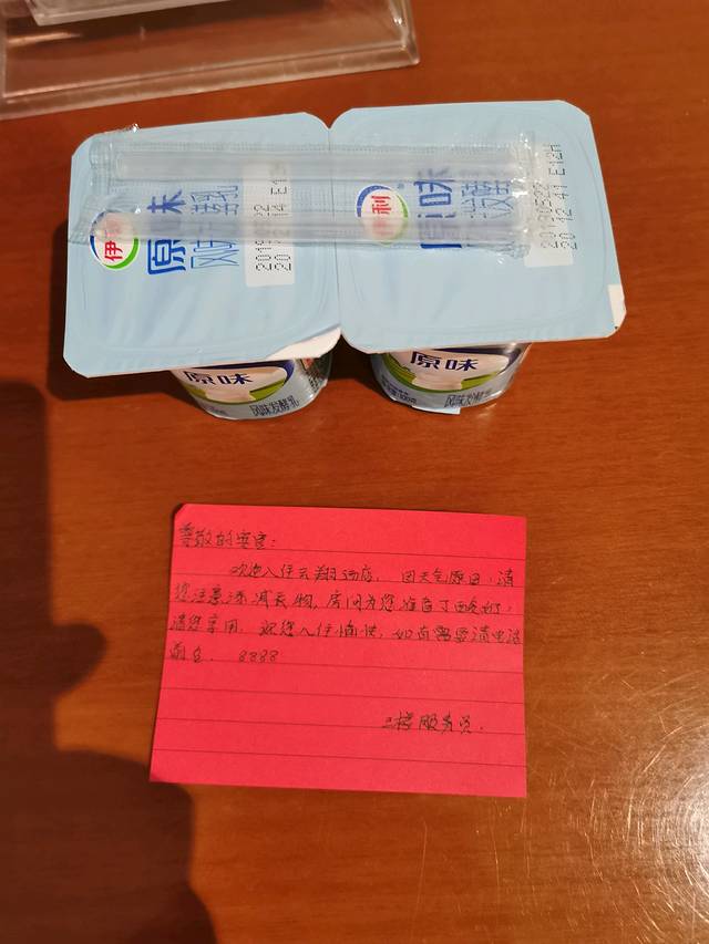 饭后回到酒店,看到房间里送了两盒酸奶,还有一个温馨提示的纸条,这让人比较舒服!