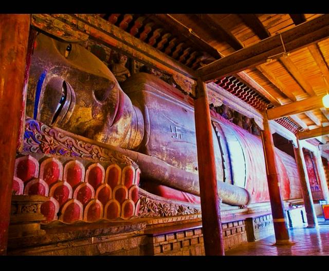 寺内安放有国内最大的室内卧佛,他安睡在大殿正中高1.2米的佛坛之上,佛身长34.5米,肩宽7.5米,耳朵约4米,脚长5.2米。大佛的一根中指就能平躺一个人,耳朵上能容八个人并排而坐,可见塑像何等的庞大了。