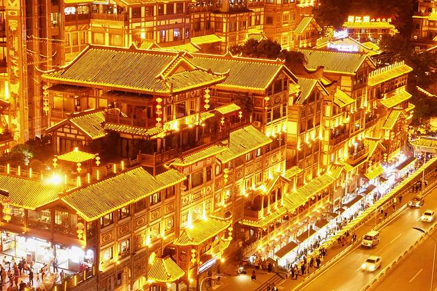夜晚的洪崖洞,会让人错觉穿越到《千与千寻》的动画里。那些依着山势而建的吊脚楼,写满巴渝的传统色彩。