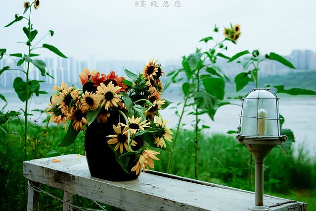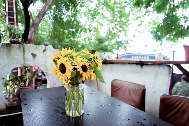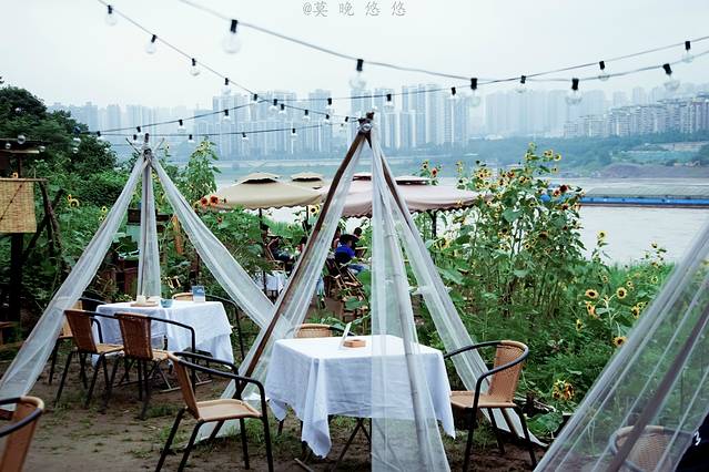 除了怀旧,还融入了新的元素在其中,房屋下边的空地上,架起一座座飘逸着白纱的小帐篷,每个小帐篷下面便是可以小憩的雅座了,而帐篷之间也有彩灯串联着,晚上的时候亮起来一定十分浪漫。而雅座周围则种满了向日葵,花开正好,为重庆的阴沉天气增添几分明媚。