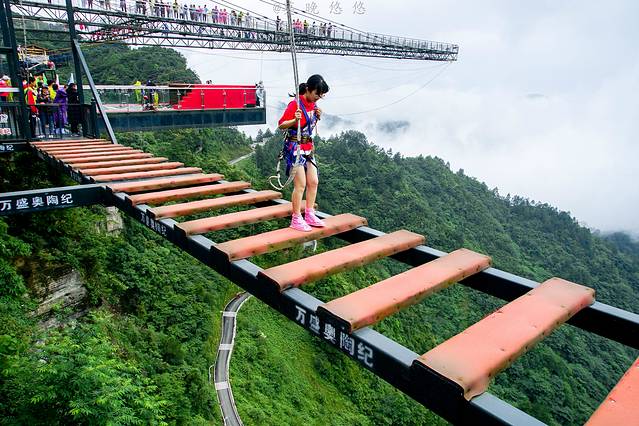 一、高空体验类有:天空悬廊,云端廊桥,玻璃天梯,玻璃吊桥,高空速滑,丛林穿越等;这一类只要没有特别严重的恐高症,都可以HOLD得住,还能欣赏山里的秀丽风景。